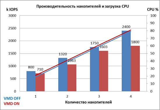 Как видим, поддержка VMD не бесплатна – падение производительности составляет от 10 до 25%. Но зато она обеспечивает возможность горячей замены накопителей, корректную работу индикаторов состояния накопителей, а также поддержку RAID-массивов.