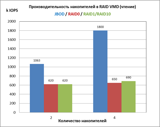 RAID-массивы из накопителей NVMe на базе технологии VMD, обеспечивая целостность данных, увеличивают производительность дисковой подсистемы только на операциях записи.