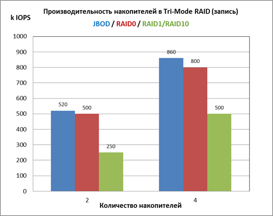 К Tri-Mode RAID-контроллеру можно подключить обычно не более 4 накопителей NVMe. При этом Tri-Mode RAID-контроллер с NVMe-накопителями работает точно так же, как с накопителями SAS или SATA, и общая производительность накопителей будет ограничена максимальной производительностью контроллера по IOPS'ам (у современных контроллеров это 1.5 – 1.8 MIOPS).
