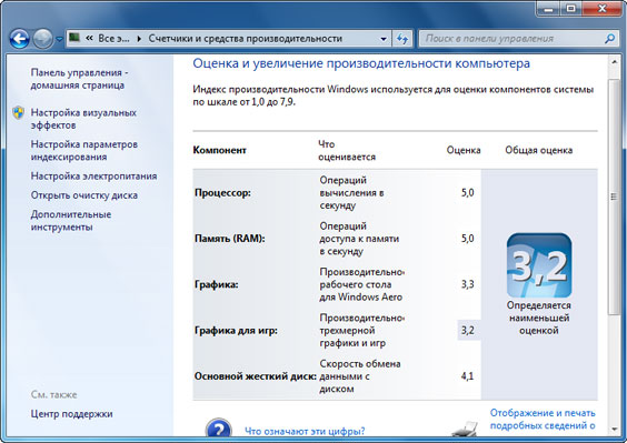 Каждый аппаратный компонент получает отдельную оценку. Базовое значение индекса производительности компьютера определяется самыми низкими очками в данном подуровне оценки. Например, если отдельный компонент получил самую низкую оценку в 3,2 очка, базовый индекс производительности также равен 3,2. Базовый индекс производительности не является средним значением оценок. Однако отдельные оценки могут дать представление о производительности компонентов и помочь понять, какие компоненты требуется обновить.