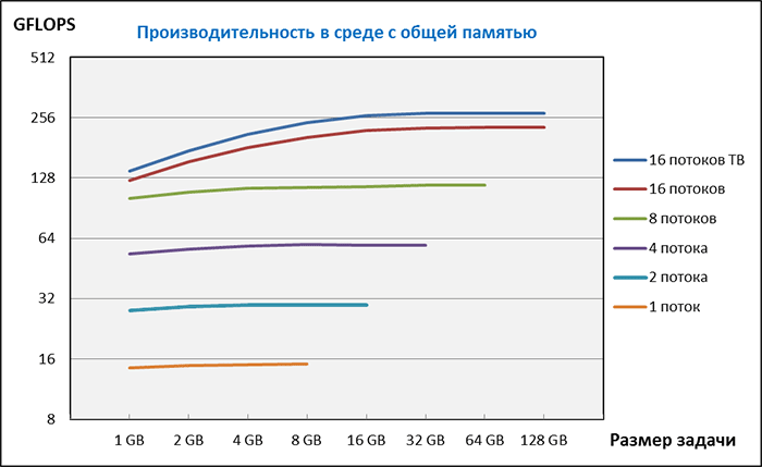 Обратите внимание, что обе шкалы на графике логарифмические. Оказалось, что удвоение числа потоков практически удваивает производительность, которая на больших задачах во всех случаях близка к теоретическим пределам. При небольших размерах задачи производительность меньше из-за большей доли операций обмена в общем объеме операций.