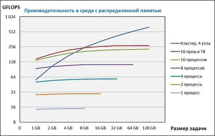 При увеличении размера задачи N общее количество вычислений растет пропорционально N в третьей степени, а количество обменов между параллельными процессами растет пропорционально N во второй степени (приблизительно). Таким образом, доля обменов в общем времени выполнения задачи снижается, а вычислений — увеличивается. Поскольку мы измеряем скорость вычислений, а не обменов, при увеличении размера задачи измеряемая производительность системы растет. Исключением является последовательная задача, которая не содержит операций обмена, поэтому для нее производительность от размера зависеть не должна.