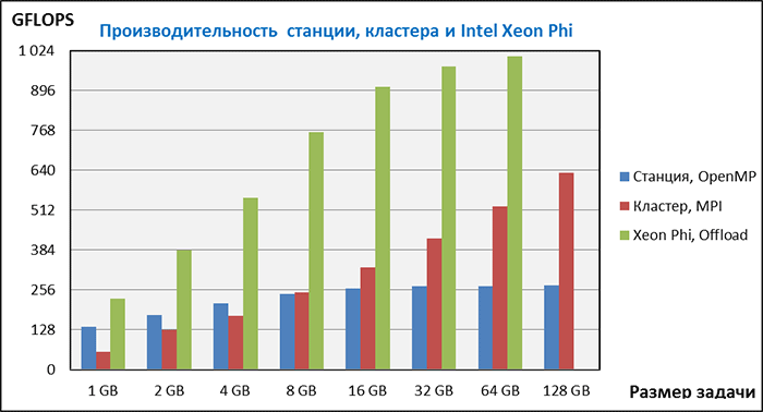 В этот режиме размер задачи не ограничен размером локальной памяти вычислительного модуля. Мы выполняли тестирование производительности Intel Xeon Phi именно в этом режиме.