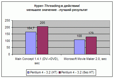 Не все пользователи, выбирающие новый ПК знают о тех преимуществах, которые обеспечивает использование технологии Hyper-Threading в современных процессорах Intel Pentium 4. В оптимизированных для Hyper-Threading приложениях увеличение производительности может составлять от 13% до 20%! Это означает, что Вы сможете выполнять свою работу быстрее! Кроме явного повышения производительности, которое можно измерить объективно, повышается такая характеристика компьютерной системы, как «отзывчивость». Компьютер, работающий под управлением ОС с поддержкой HT (WinXP, Linux) при выполнении одной задачи/программы быстрее сможет обработать фоновую задачу запущенную пользователем. Приведем, для примера, результаты тестирования процессоров Intel популярным сайтом Tom’s Hardware Guide, Russia: