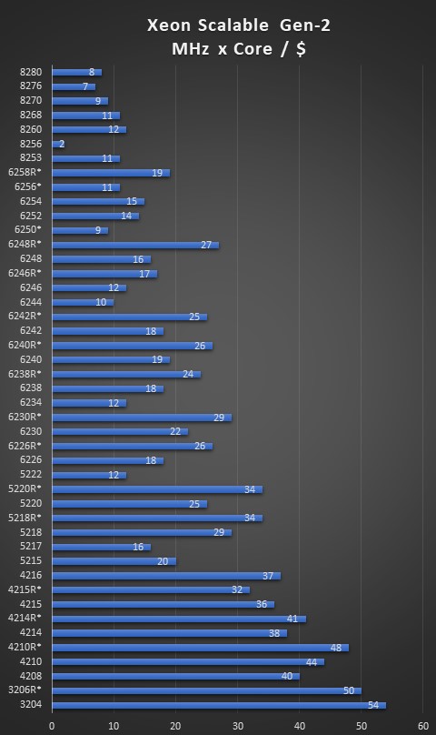 Новые процессоры, имеющие суффикс «R» в обозначении модели, могут использоваться только в одно- и двухпроцессорных системах. Для вашего удобства мы подготовили сравнительную диаграмму удельной производительности процессоров Intel Xeon Scalable Gen-2 (новые модели на диаграмме помечены звездочкой). ![]() Процессоры с низким показателем «производительность/$», - это специализированные модели с небольшим количеством ядер и высокой рабочей частотой, предназначенные для однопоточных приложений. Все новые процессоры добавлены в конфигураторы наших серверов на платформах Intel и Supermicro. 20.03.20 – Двухпроцессорные серверы HPE ProLiant DL385 Gen10 Plus
