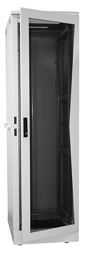 Шкафы выполнены в 19" стандарте. Основой несущей конструкции являются цельносварные рамы, соединенные между собой верхней крышкой и нижним основанием. Несущая конструкция выполнена из 1,5мм стали. Направляющие выполнены из 2мм стали. Передняя и задняя дверь выполнены из 1,5мм стали, а боковые стенки выполнены из 1мм стали. Боковые стенки легкосъемные с замком и двумя защелками каждая. Передняя дверь снабжена ручкой с замком и может быть как со вставкой из ударопрочного тонированного в массе стекла, так и глухой металлической. В комплект к шкафу входят 13 ключей.