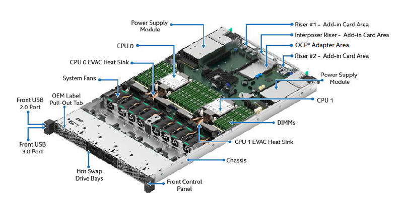 • до 2 CPU Intel Xeon Scalable (Gen3, 10нм), до 40 ядер на процессор, до 160 логических CPU на сервер;