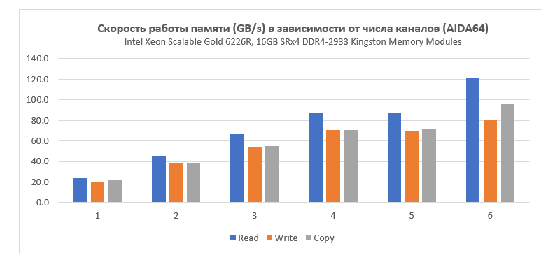 Последняя рекомендация очень важна. Мы довольно часто получаем запросы с вариантами конфигураций, в которых установлено по одному или два модуля памяти большой емкости на процессор (используется один или два канала памяти). Объясняется это желанием сохранить возможность увеличения объема памяти сервера в будущем до максимального значения. Желание вполне понятное, но при таком подходе производительность подсистемы памяти будет далеко не оптимальной. На следующем графике показана зависимость скорости подсистемы памяти от числа задействованных каналов. Хотя тестирование проводилось нами на шестиканальном Xeon Scalable 2-го поколения (Cascade Lake) с памятью DDR4-2933, для восьмиканальных Xeon Scalable Gen3 (Ice Lake) картина будет такой же.
