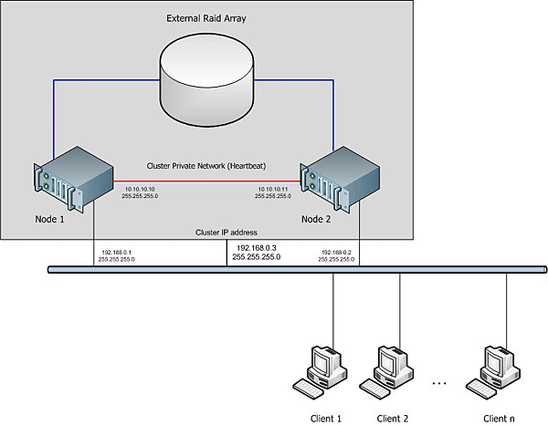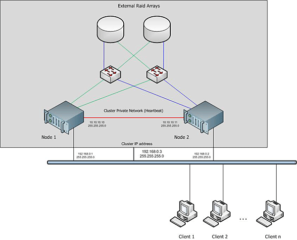 Эта схема представляет собой несколько усложненный вариант предыдущей. Внешняя система хранения данных обычно подключается по интерфейсу SCSI или Fiber Channel (FC). При использовании SCSI интерфейса существует ограничение по количеству узлов, обусловленное количеством SCSI портов массива.