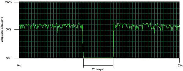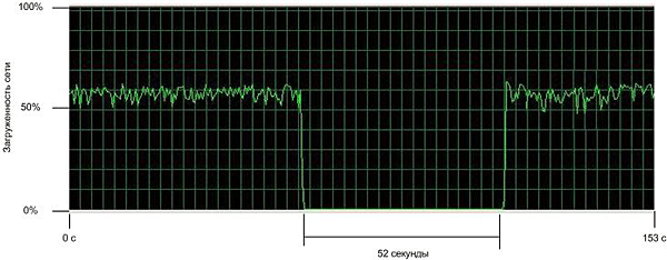 График ниже также представляет сетевую активность одного из клиентских компьютеров. Здесь можно заметить, что время недоступности сервиса по сравнению с первым случаем увеличилось примерно в два раза и составило 52 секунды.