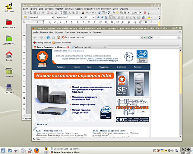 Компьютеры Team с предустановленной ОС ALTLinux позволяют выполнять типовую офисную работу непосредственно "из коробки" : работу с документами, электронными таблицами, с интернет и электронной почтой. Запись CD/DVD-дисков, воспроизведение DVD-видео — все это доступно сразу, без приобретения и установки дополнительного ПО и драйверов. Возможно подключение и работа в существующей в организации сети Windows (в рабочей группе или домене*), печать на удаленные принтеры и т.д.