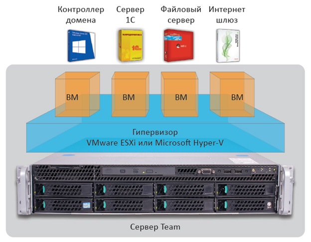 В компании имеется сервер, на котором работают в одной операционной системе необходимые приложения: контроллер домена, файловый сервер, сервер для 1С, интернет-шлюз и другие.